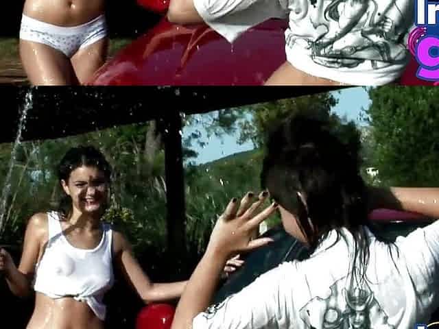 Two Hot Brunette Naked Carwash showing big medium tits and perfect ass