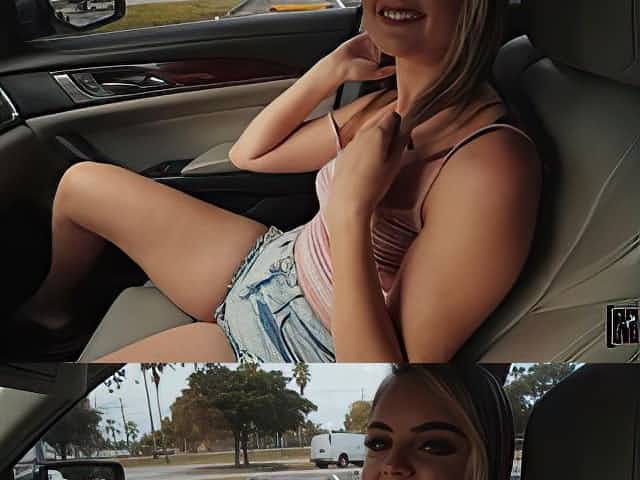 Cute hitchhiker Lexie Fux gives a blowjob in a car and gets fucked in the back seat