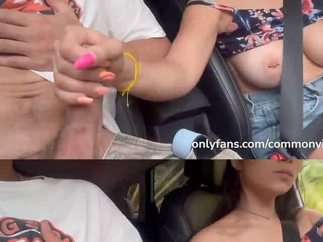 Horny amateur tourist gives a steamy outdoor blowjob to her buddy, with a hot cumshot in the car