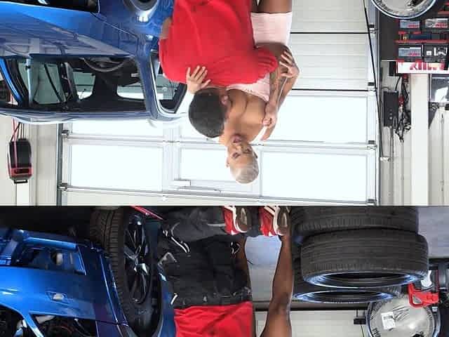 Blonde with giants tits licks car mechanics ass