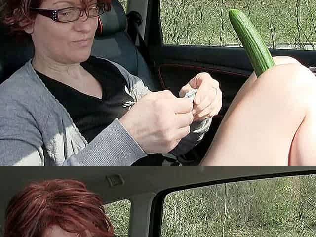 Long video of nerdy brunette sucking and fucking in a car, then masturbating outdoor with a big dildo