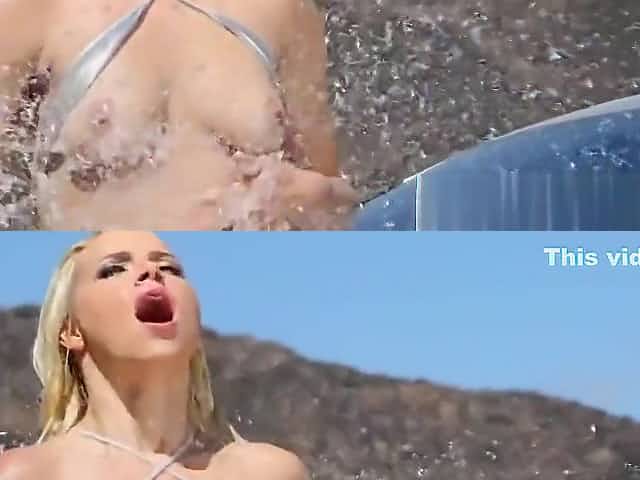 Bikini carwash of busty blonde turns into lesbian kissing and hardcore public sex with big titted babe fucked outdoors