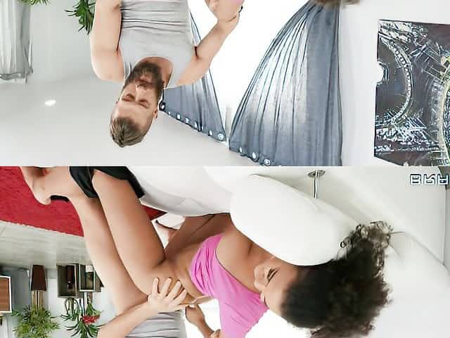 Dark-skinned hottie with big tits fulfills her needs with a white cock