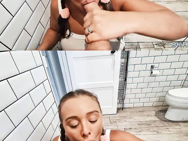 Seduced busty wife Beth Bennett sucks a long dick in the shower
