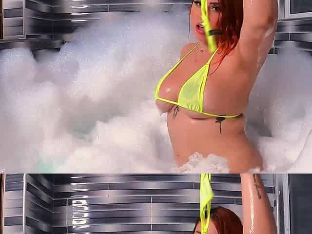 A busty blonde bimbo surprises her even bustier neighbor in a bikini and oils her tits