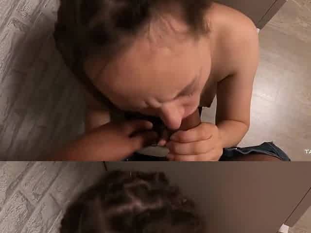 Busty stepmom sucked stepson's dick and was almost caught by her husband