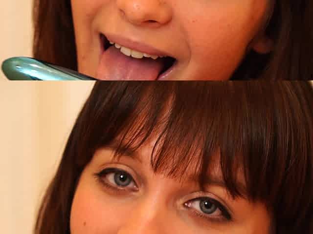 Brunette and Horny Lola gets cum on her cute face by after caught masterbating