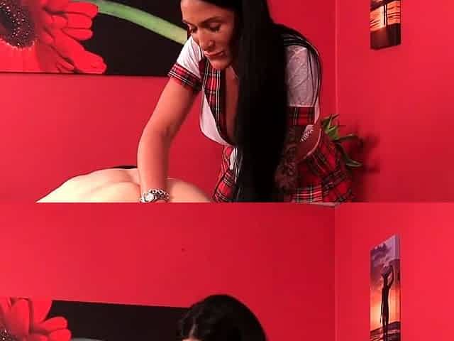 Beautiful women with long hair give a sensual cfnm massage with oil.