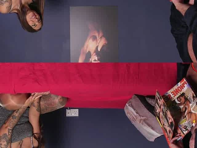 Long-haired beauty Maddison Lee in a cfnm encounter with a tattooed stud.