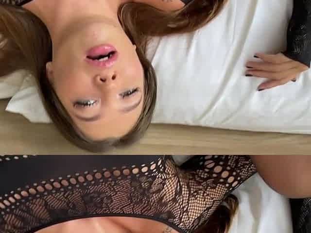 Brunette bombshell Christina Santes gives a sloppy blowjob in cowgirl position