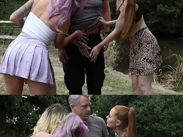 Nasty CFNM babes cocksucking old guy