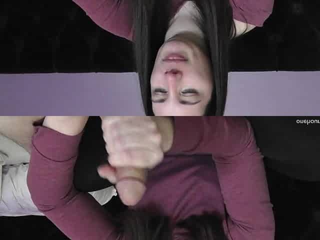 Japanese cute babe wearing Pornhub T-shirt gives a guy a handjob with showing her panties.