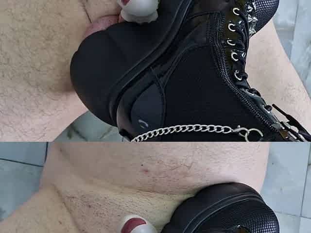 Dominant Nika humiliates submissive with brutal ball and cock trampling in chastity belt