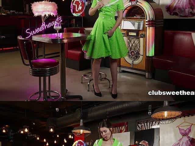 Petite Beauty waitress rubs her pussy while it's empty in the rockabilly bar.