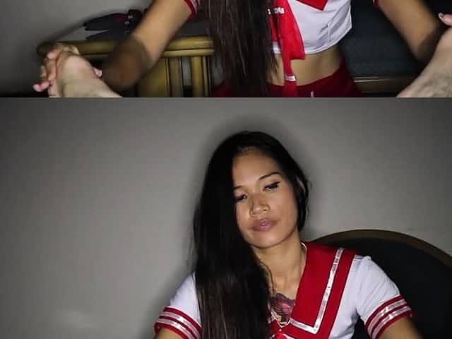Lunna Vaz is sucking a large rod and getting it from the back, on the chair