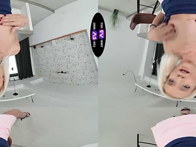 "Solo tattooed blonde with long hair Iris masturbating on chair in VR."