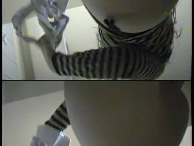 Dressing room spy cam shot girl putting on the bikini
