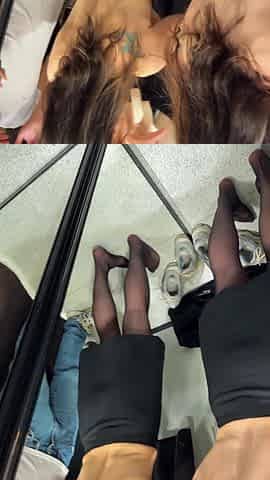 Public dressing room, a view from beneath on a wet booty and large boobs, upskirt view