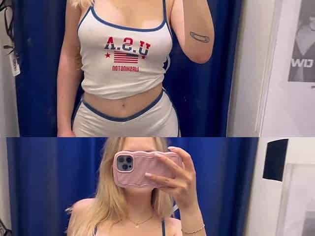 lalin girl in changing Room looks right at camera