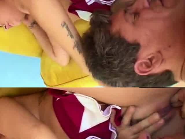 Horny cheerleader Indigo Dances opens legs for sexy Shae Kink