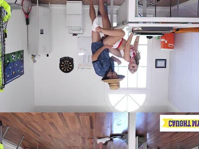 Asian Cheerleader s stretching routine interrupted by neighbor
