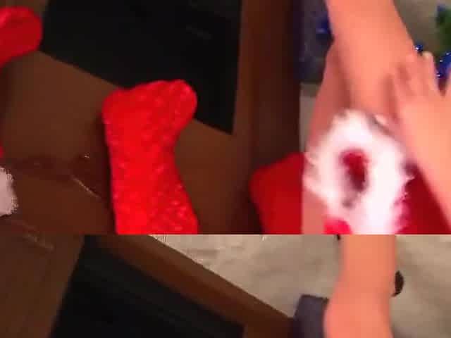 Excited brunette hair Santa gets her vagina stuffed with cream for Christmas.