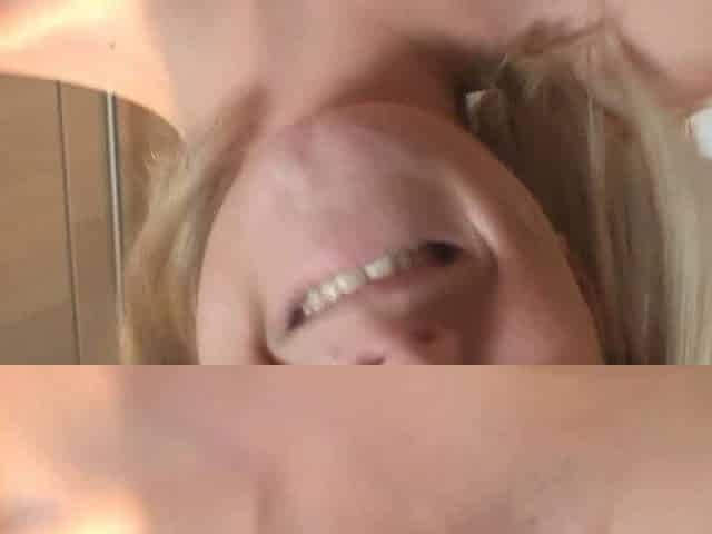 Plump blond in pigtails and petticoat sucks rod in front of mirror