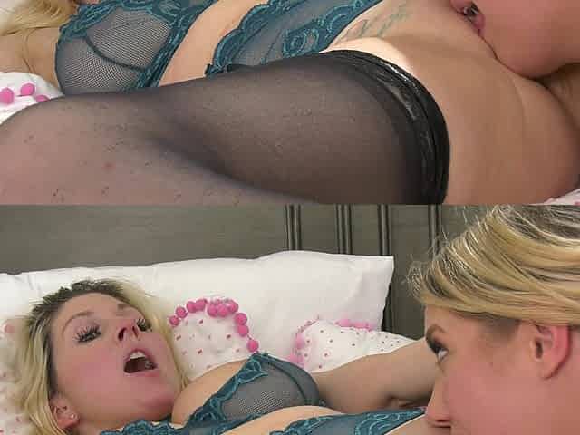 Beautiful blondes in hot lesbian scene with high heels and wet pussies.
