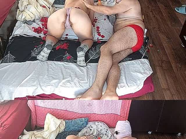 First-time couple makes out in bed while amateur MILF does yoga and enjoys her hairy pussy
