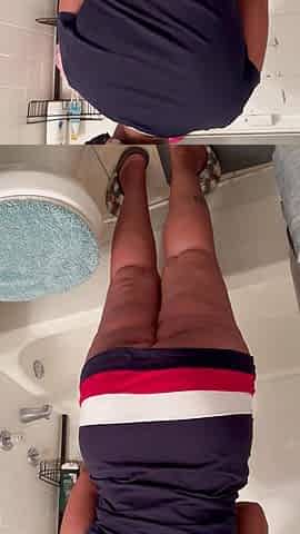 teen wearing pink micro belt teasing from the taut jeans in whale tail fetish cleaning washroom