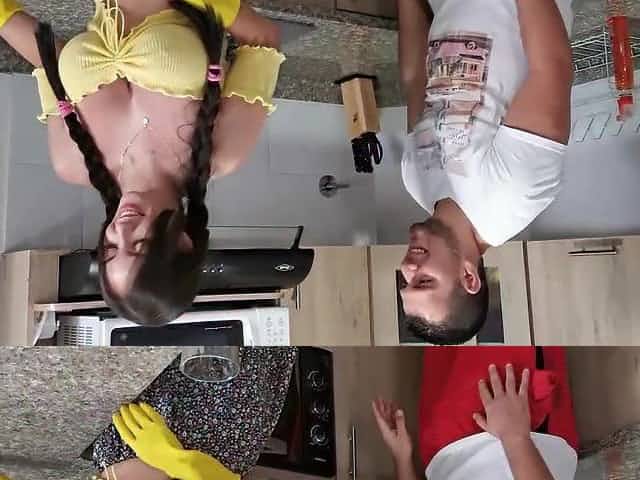 Slutty stud is in the mood to screw a hawt cleaning lady, in the kitchen
