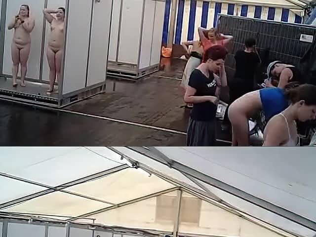 Dozens of actresses shower in tented locker area