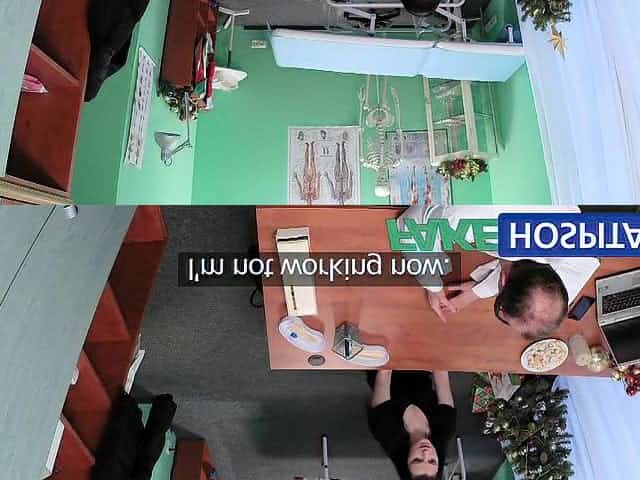Doctor screws fat patient on a desk in fake hospital