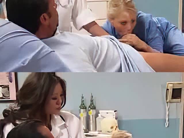 Blond nurses had group sex in the hospital, the other day, with one of the patients