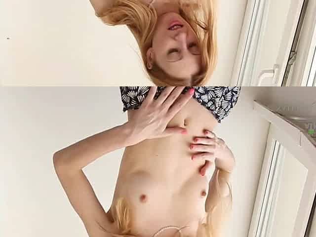 Pale slim golden-haired undresses without her clothing to play with her bush and rub her clitoris.