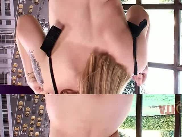 See breathtaking golden-haired in crotchless ebony underware masturbate