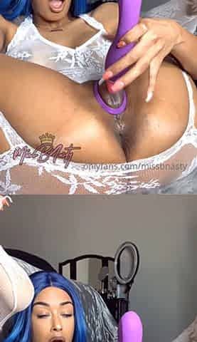 blue haired ebony milf cums from her clit sucker