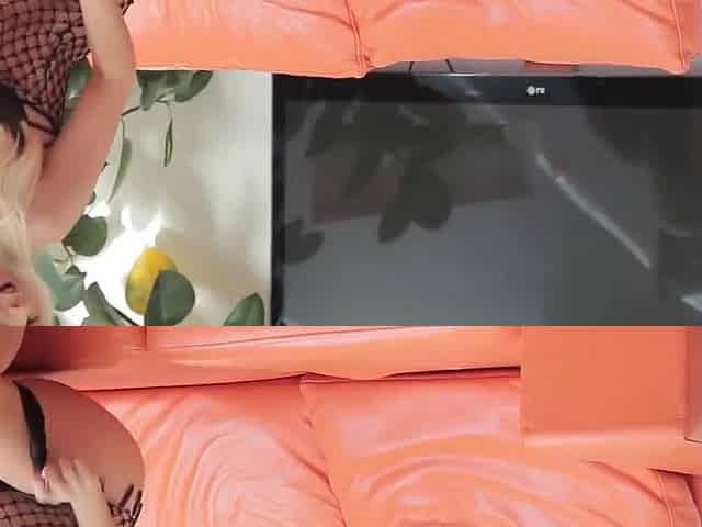 Two horny sluts on the couch rub each others clitoris