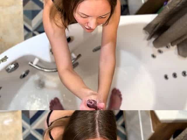 Stepmother gave a drooling blowjob in the bathroom. POV