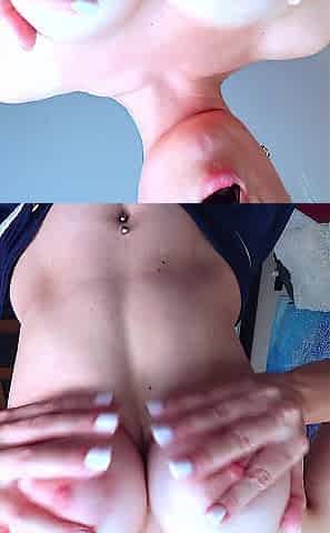 Playing with those large breasts with a moist t-shirt in advance of a titsjob and ending tugjob on melons