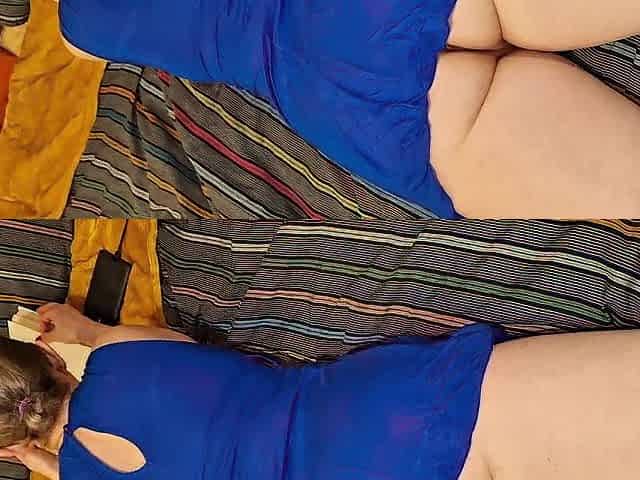 In a suit out of pants.The wife is reading a book.Wife's curly stretchy vagina.