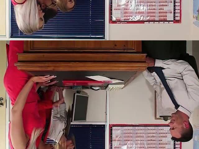 Busty clothed office babe