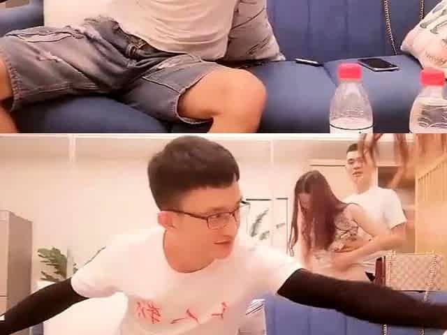 Butt plowed Asian teen drooling on dick in threesome