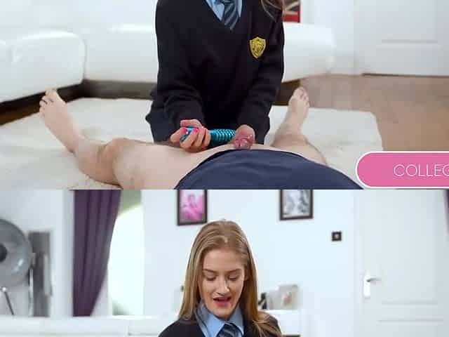 Kinky blonde flatmate Chessie Kay offers perverted oral pleasure in a school uniform