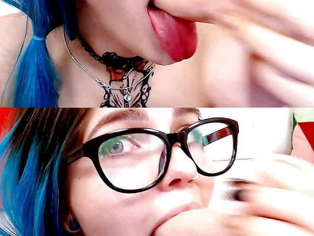 Cute college girl with blue hair deep facefuck dildo - closeup