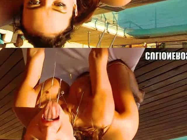 Hot Latin doll gets a juicy cumshot after passionate sex by the pool.
