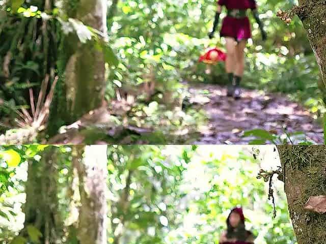Little Red Riding Hood walking alone in the forest