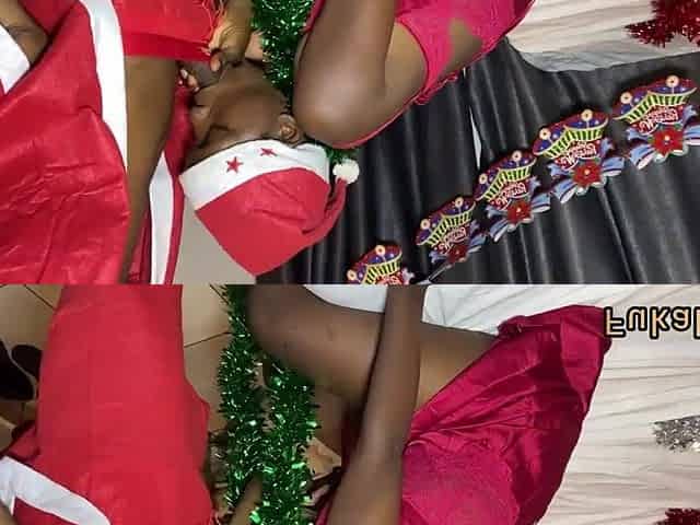 On the 1st day of Christmas Black teen took off the condoms and asks large knob Santa to cum inside her snatch