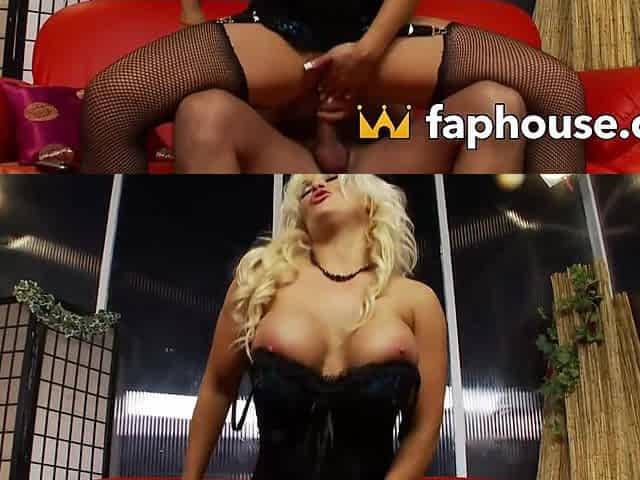 Hot Blonde W/ Big Fake Tits Corset Thigh Highs Sucks Dick Deepthroat Spit