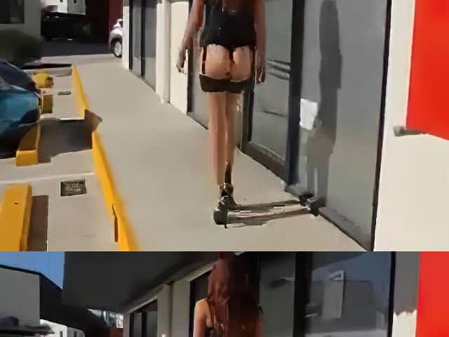 Slim schoolgirl in stockings corset walks in the parking lot